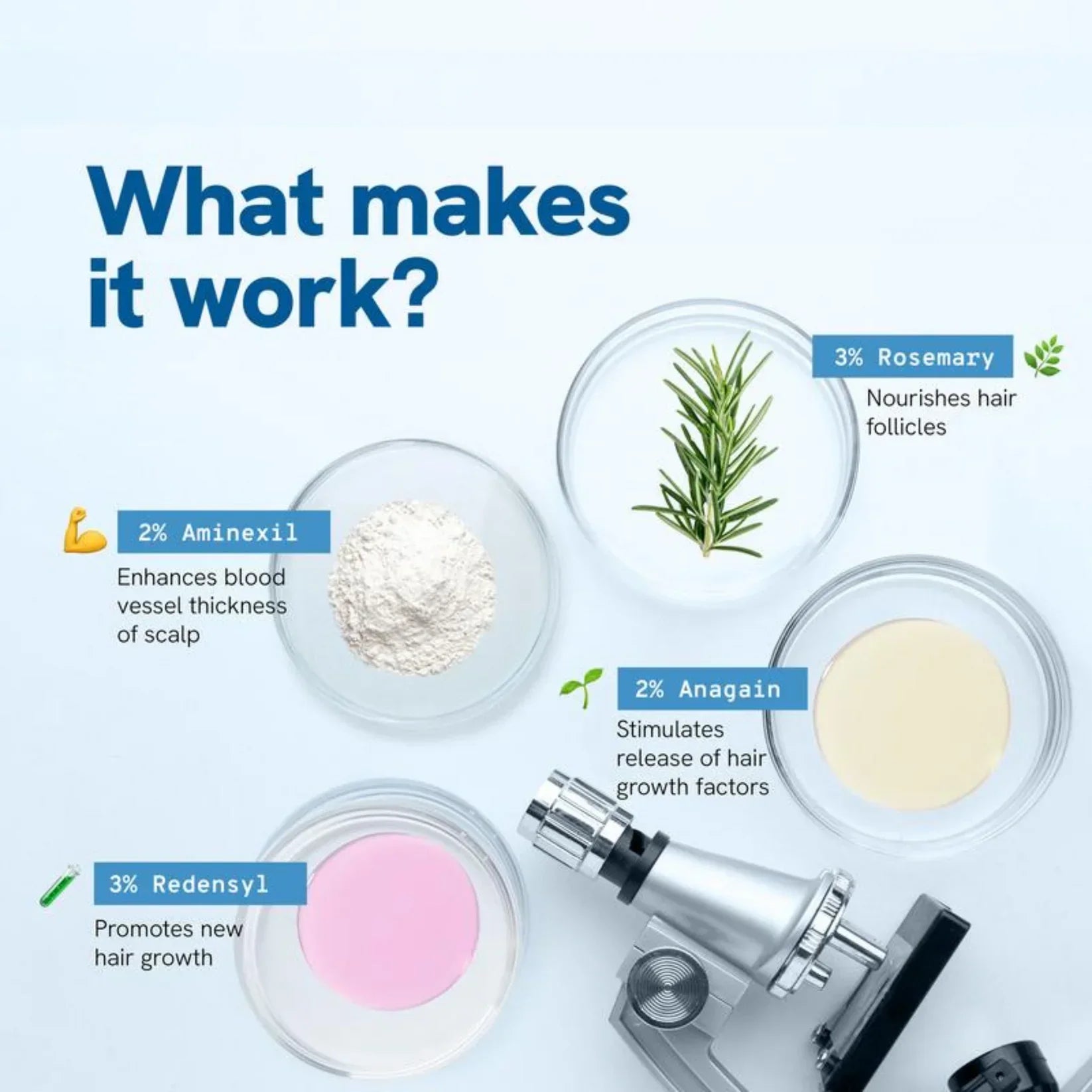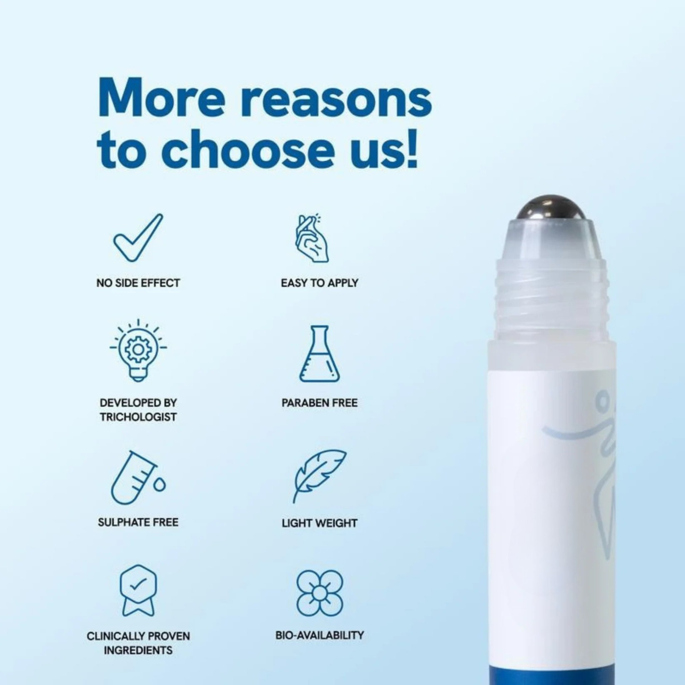 ✔ A TARGETED, NO-MESS APPLICATION The precision rollerball allows you to apply the potent, non-greasy serum directly to your scalp and thinning areas. Unlike messy droppers or imprecise sprays, it ensures 100% of the formula gets to the root where it's needed, with zero waste on your hair strands.