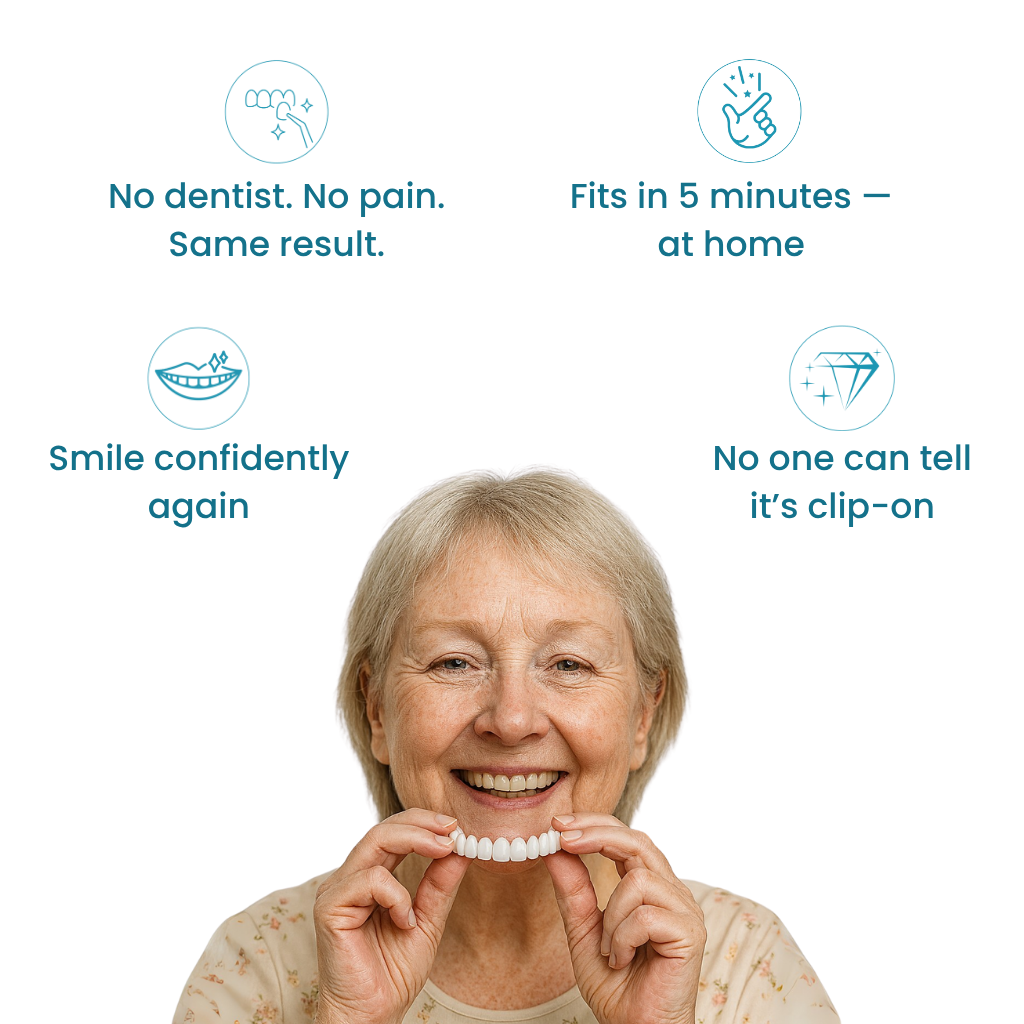 ✔ GET YOUR DREAM SMILE IN 5 MINUTES The simple, at-home fitting process is quick and easy. No dentist, no pain, no waiting—just a beautiful, confident smile in the time it takes to make a cup of tea.